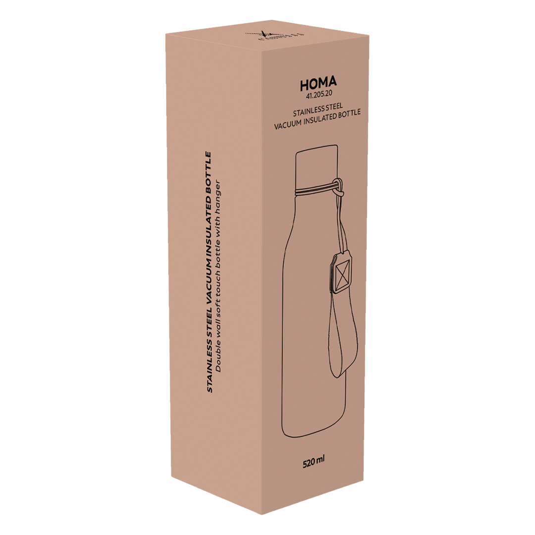 HOMA je termos boca modernog i elegantnog izgleda, namenjena korisnicima koji cene kvalitetan dizajn i izražen vizuelni efekat proizvoda. Soft touch završna obrada pruža prijatan osećaj u ruci i dodatno naglašava izgled štampe, što HOMA čini posebno pogodnom za brendiranje. Zahvaljujući dvostrukom zidu sa vakuum izolacijom, boca efikasno održava temperaturu napitaka tokom dana. Tekstilna traka za nošenje doprinosi praktičnosti, dok poklon pakovanje čini ovaj model odličnim izborom kao poslovni poklon i promotivni proizvod.